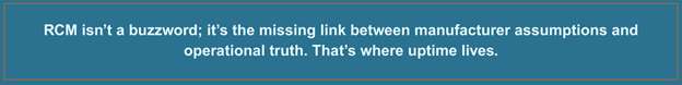 The solution to maintenance challenges lies in bridging OEM guidelines with Reliability Centered Maintenance (RCM) principles and Failure Modes and Effects Analysis (FMEA). This hybrid approach allows operators to: